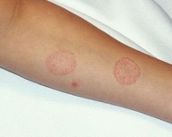 В месте внедрения гриба появляется отечное, возвышающееся красное пятно с четкими границами. Постепенно пятно увеличивается в диаметре. По краю формируется непрерывный возвышающийся валик, представленный мелкими узелками, пузырьками и корочками. В центральной части пятна происходит разрешение воспаления, вследствие чего кожа приобретает бледно-розовую окраску, с отрубевидным шелушением на поверхности. Таким образом, очаг имеет вид кольца.