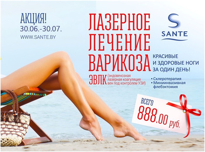 КРАСИВЫЕ, ЗДОРОВЫЕ НОГИ, УВЕРЕННЫЙ ШАГ И ПРЕКРАСНОЕ НАСТРОЕНИЕ! Всем этим мы спешим с вами поделиться! Воспользуйтесь нашим уникальным предложением с 30.06 по 30.07.2017г. ЭНДОВЕНОЗНАЯ ЛАЗЕРНАЯ КОАГУЛЯЦИЯ ВЕН ВСЕГО ЗА 888.00 рублей